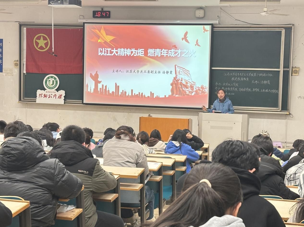 汤静霞老师围绕两方面内容展开宣讲:一是深入领悟江大精神,巩固理想信念;二是积极践行江大精神,书写青春奋斗篇章。汤老师深情讲述了个人经历与江苏大学的历史渊源,特别提到了镇江农机学院时期的艰苦奋斗岁月,向学生们生动展现了坚韧不拔的精神风貌。汤老师还提到,青年学子应汲取前辈的宝贵经验,积极投身学习和科研,努力成为实现第二个百年奋斗目标的见证者和参与者;最后,汤老师寄语全体学生,希望他们能够怀抱梦想,勇于创新,不断突破自我,在人生的道路上书写精彩的青春篇章,为中华民族伟大复兴贡献力量。