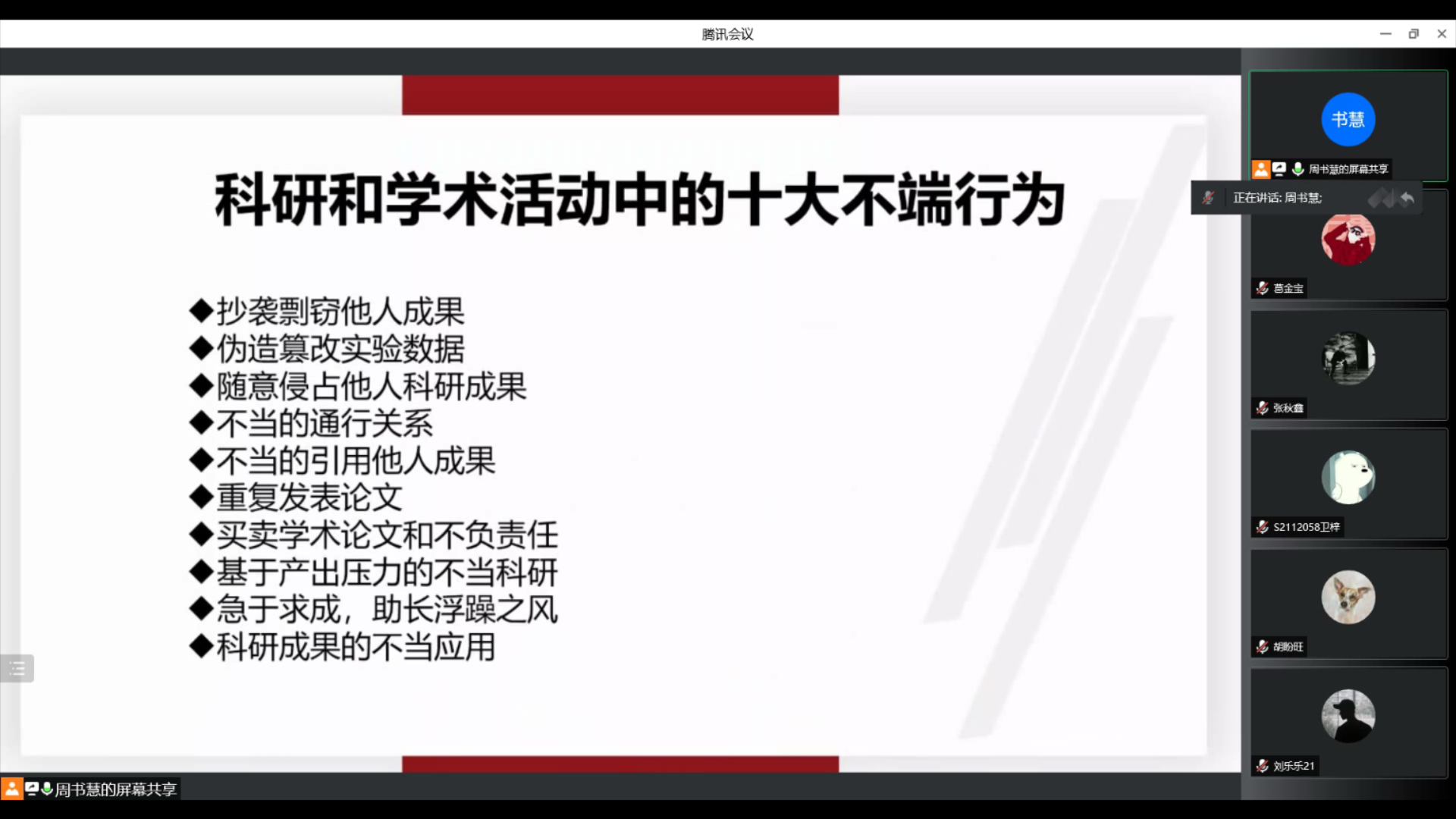 班会从“科研和学术活动中的十大不端行为”、“科研不端/不当行为的危害”、“研究生论文中的学术不端现象”三个方面论述了研究生遵守科学道德,加强学风建设的重要性。