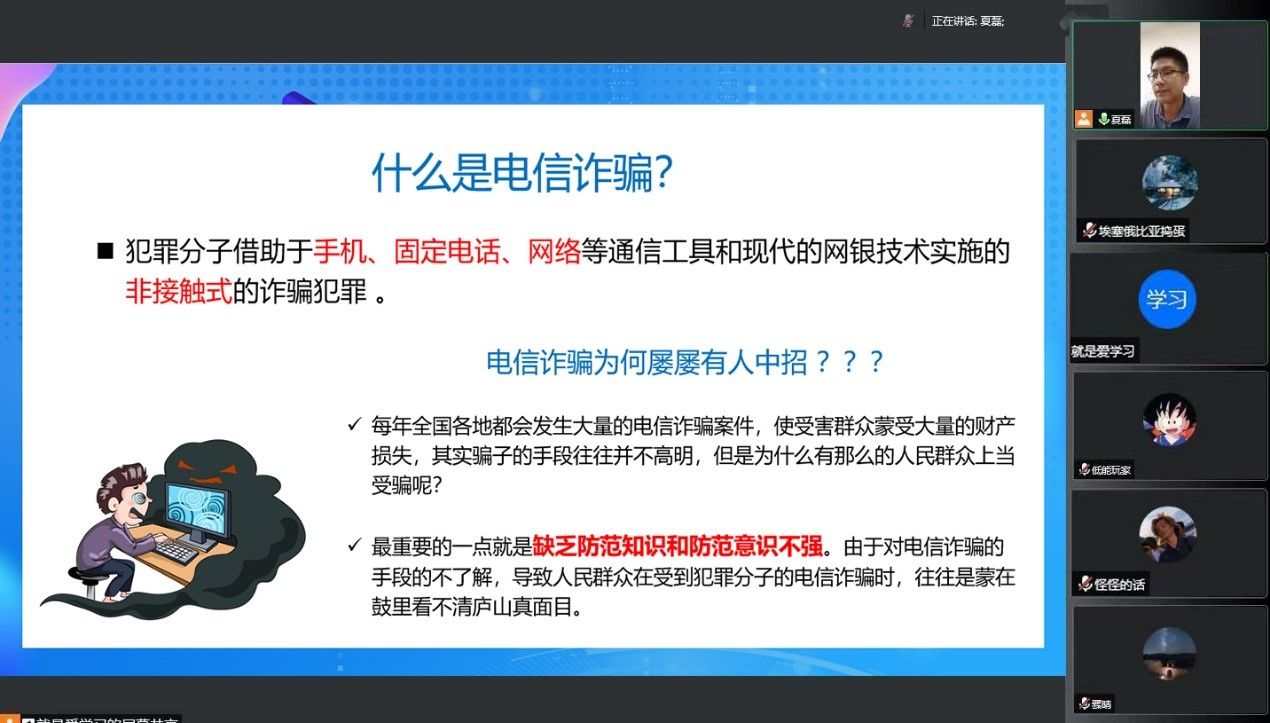 为进一步提高新生防范诈骗意识,教育和引导同学们树立自觉抵制电信网络诈骗的安全观念,近日,化学化工学院研究生辅导员夏磊老师通过腾讯会议平台开展“防范电信网络诈骗学习与宣传”主题班会,全体2022级研究生参加。