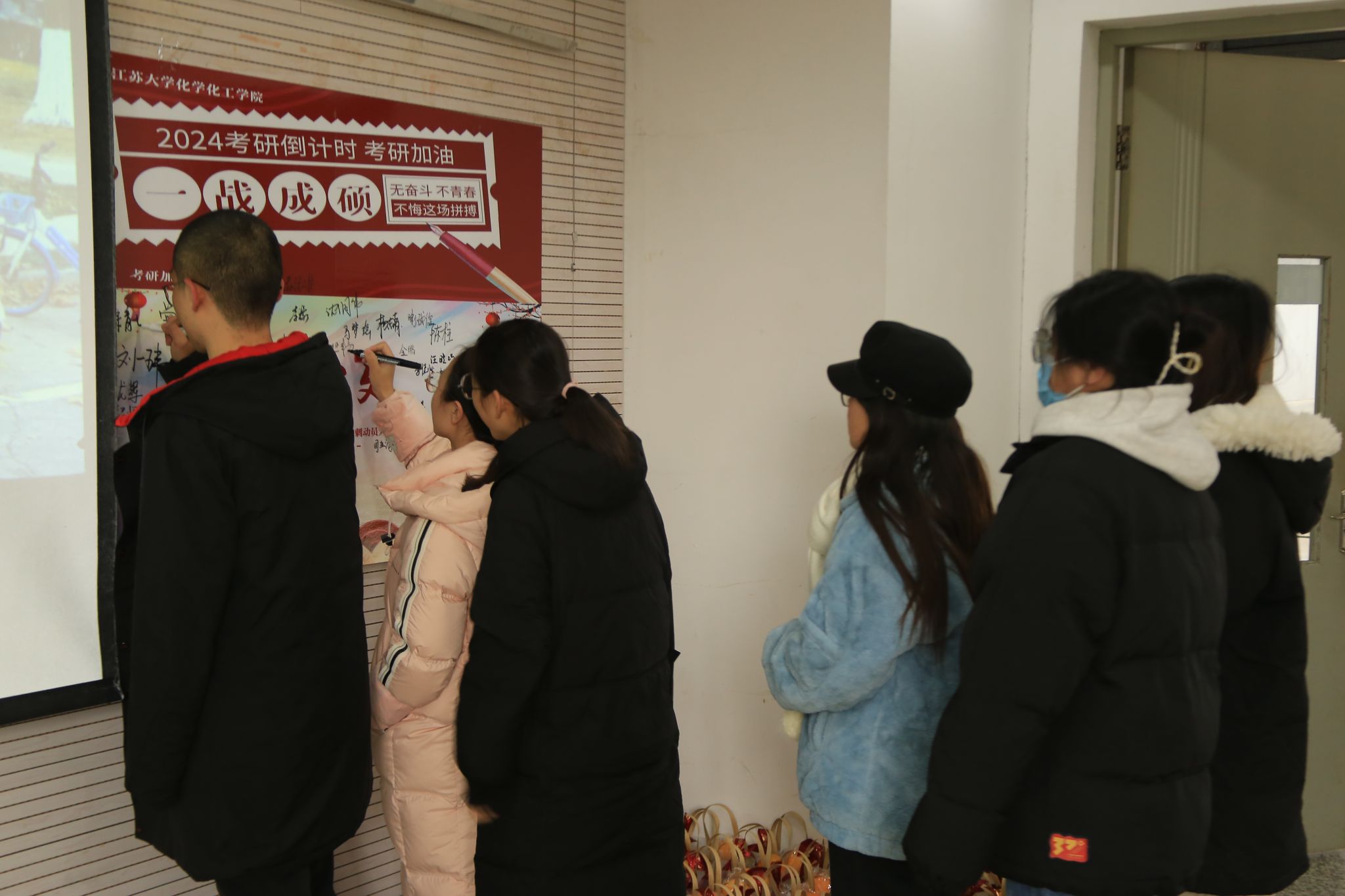 院长潘建明代表学院首先向考研学子们表达了真挚祝福,并从坚定信心、劳逸结合、心态调整三个方面为同学们提出宝贵建议,鼓励同学们以最好的精神状态迎接考试。院党委副书记、副院长胥桂宏叮嘱同学们要相互扶持,相互鼓励,结伴而行,遇到困难及时与辅导员老师交流沟通。关工委张老师与同学们亲切交流,勉励大家坚定必胜的信念,交出满意的答卷。随后,学院领导老师为同学们发放学院精心准备的“考研加油包”,祝愿考研学子能够旗开得胜、成功上岸。同学们在“一战成‘硕’”签名墙上写下美好心愿,并手持加油牌与老师们合影留念,大家齐声喊出“考研必胜”。