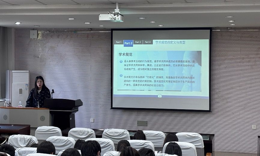 讲座开始,崔老师深刻阐释“学术道德”的内涵,指出学术道德是社会道德在科研领域的映射,是科研参与者应遵循的行为准则和道德规范,对营造健康学术生态意义重大。在学术规范部分,详细介绍了学术引用规范和学术注释规范,指出学术规范是学术共同体运行的保障,能确保学术活动科学、高效、公正开展,提升学术共同体公信力。