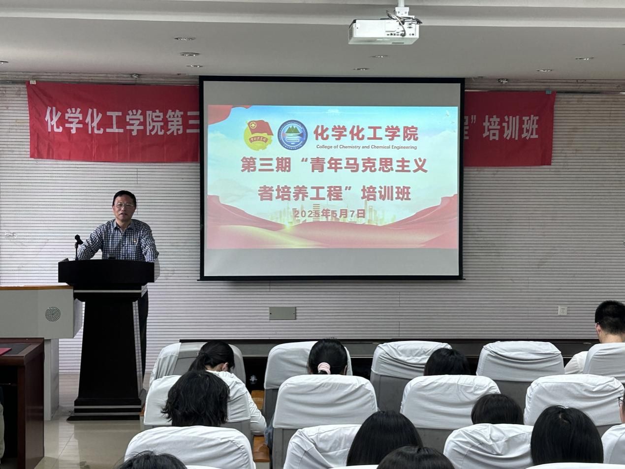5 月 7 日下午,化学化工学院邀请学校党的创新理论宣讲团成员、校关工委常务副主任柴顺根老师为院级青马工程学员、团学骨干、预备党员和毕业生党员宣讲党的创新理论。