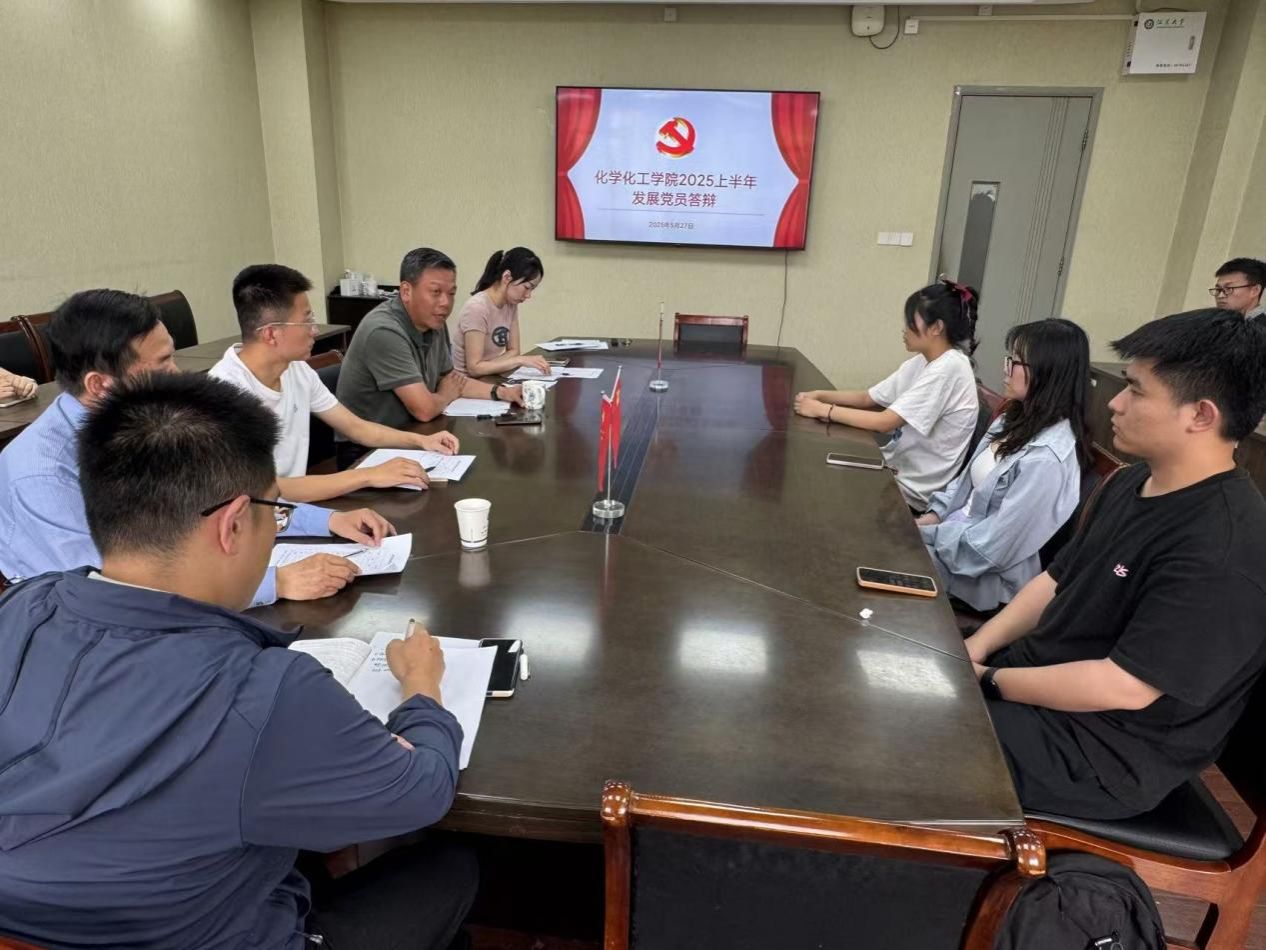 为规范党员发展流程,把好党员发展的思想关、政治关、组织关,加强和推进党员队伍建设,为党组织注入新鲜血液,2025年5月27日,化学化工学院开展发展对象答辩会。院党委副书记、副院长胥桂宏、院关工委徐德选老师、化工专业本科生党支部书记齐廉文、化学与应化专业本科生党支部书记夏磊、本研辅导员参加活动。