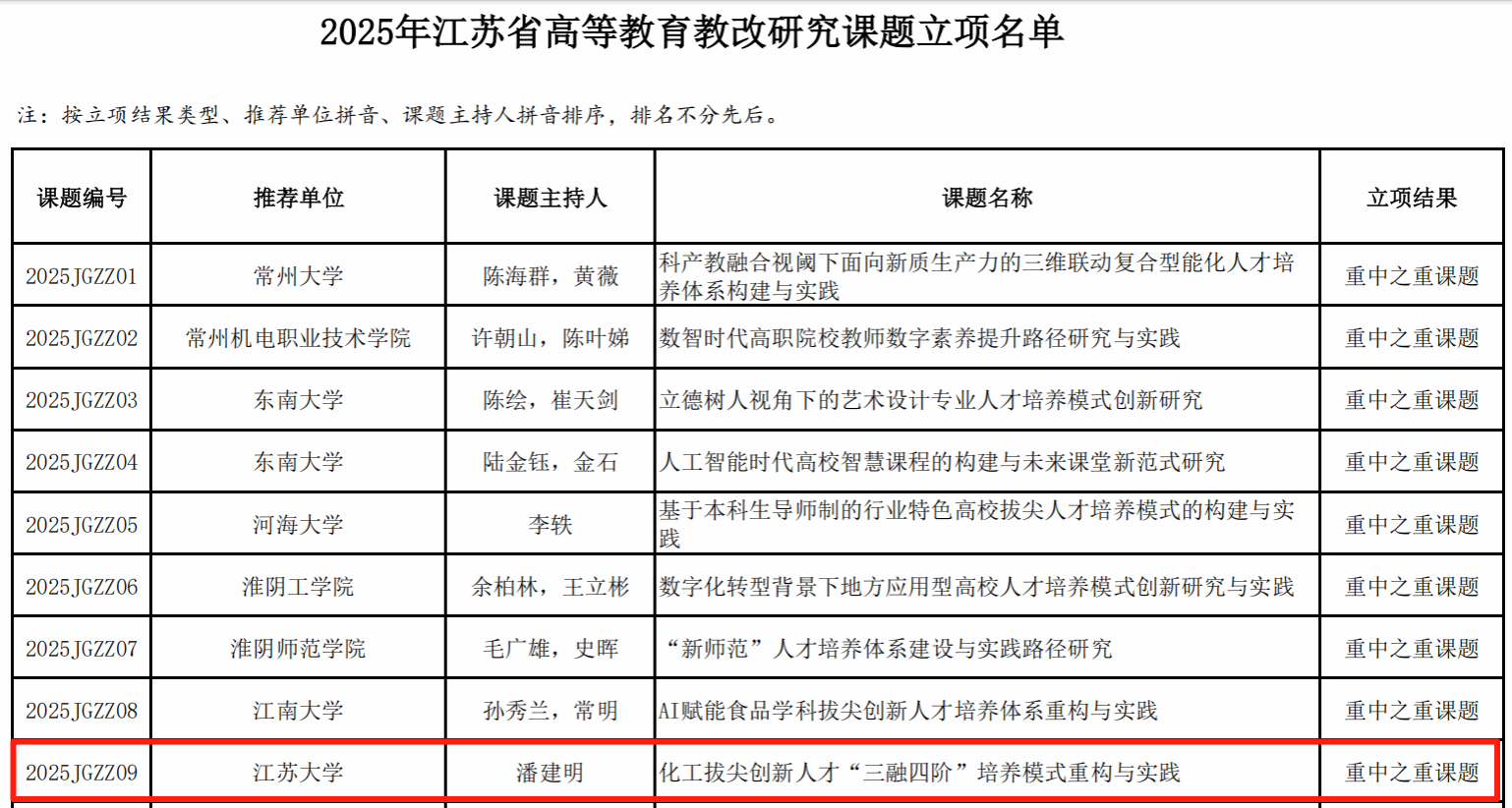 近日,江苏省高等教育学会发布《关于公布2025年江苏省高等教育教改研究立项课题评选结果的通知》(苏高教会〔2025〕30号),我院潘建明教授主持的课题《化工拔尖创新人才“三融四阶”培养模式重构与实践》获批重中之重项目。