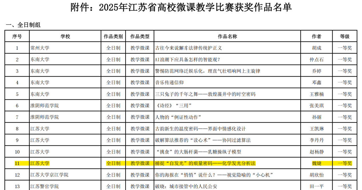 根据《关于举办2025年江苏省高校微课教学比赛的通知》(苏高教信研[2025]5号),经学校遴选、线上报送,全省共152所院校推荐了参赛作品。经专家在线评审和会议复核,共评审出获奖作品929项(不含军事院校),其中全日制组一等奖作品125项,二等奖作品274项,三等奖作品447项;继续教育组一等奖作品12项,二等奖作品28项,三等奖作品43项。