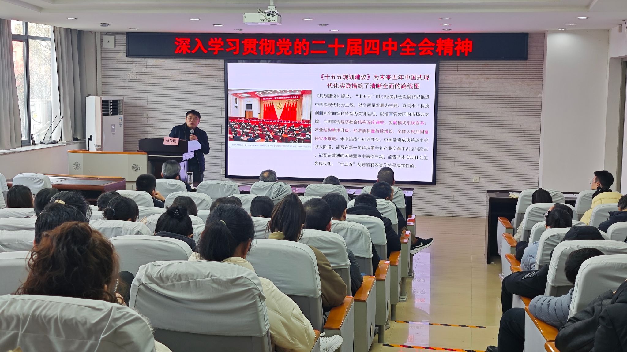 报告会上,蒋俊明教授围绕党的二十届四中全会精神,从 “十四五”时期我国取得的重大成就以及“十五五”时期的重要地位、指导思想、战略任务和重大举措等多个维度为师生作了一场高质量的宣讲报告。他指出,党的二十届四中全会和“十五五”规划建议为我国未来五年的发展指明了方向、树立了信心、明确了举措,我们应当深刻把握当前的发展形势,积极对接党和国家的重大战略部署,在科技创新和产业创新深度融合中实现高质量发展,为中国式现代化实践做出应有的贡献。