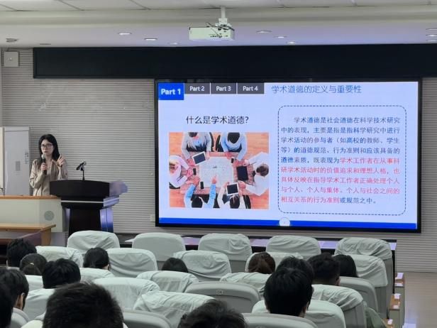 讲座最后,崔老师寄语同学:“在校研究生是我国科研队伍的重要力量,加强科学道德与学风建设是长期使命。每一位科研工作者都应心怀敬畏,以严谨态度推动学术生态健康发展。”