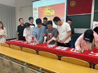 首先,副团支书组织同学们重温入团誓词,支部同学一起进行庄严宣誓。随后,四位团员同学进行了声情并茂的朗诵:礼赞五四。在回顾了五四运动的历史后,同学们一齐观看五四运动历史影片《我的一九一九》,深入了解了五四运动的重要意义和五四精神的由来。党支部的优秀党员从党史学习教育、如何成为一名优秀的党员等方面进行了诠释,团员青年们在回顾历史的同时强化了自身的使命感,加强了思想认识和先锋模范的意识。大家怀揣着青春心向党的热情,挥动着手中的党旗,齐声合唱“在灿烂阳光下”,表达对建党一百周年的礼赞。活动最后,同学们在“传承五四精神,领航红色青春”的横幅上签名。