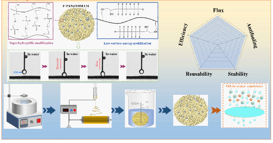 该论文聚焦乳液分离过程中膜污染问题,创新性提出一种内外双修策略构筑一种双重抗污属性的功能化聚丙烯腈(PAN)纤维膜。内部改性通过在PAN膜的纤维网络中接枝两性离子聚合物,强化膜基质的水合能力,形成稳定的水合层和平衡膜表面电荷以抵抗油污染物的表面吸附,形成“污染物抵抗”功能;外部改性通过构建低表面能微区域,降低油污染物的水下粘附,赋予膜材料“污染物释放”特性,双重抗污属性协同作用强化膜材料的抗污能力。所制备的膜展现出优异的超亲水-水下超低油粘附的润湿特性,双重抗污特性进一步强化膜材料的抗污能力,显著提升膜材料的乳液分离效果(分离通量超过2000 L·m⁻2·h-1,分离效率高达99.1%)。