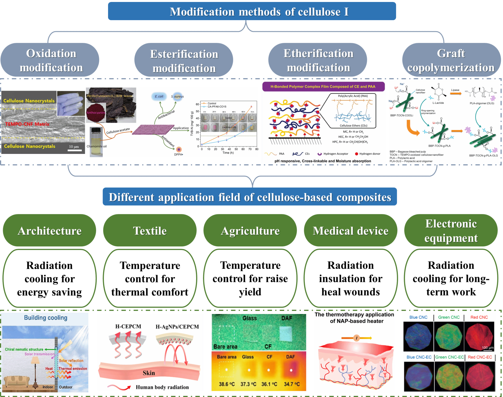 因此,本综述对近年有关纤维素基热管理材料进行了总结。首先,对常见的农业废弃物进行讨论,对内部所含有的纤维素进行归纳,总结了不同类型纤维素之间的转化关系;随后,讨论了纤维素的理化性质、提取方法和改性手段,并对相关方法的优缺点进行区分。此外,详细探讨了热管理技术的理论与现状,并总结了不同温度需求下的热管理调控策略。最后,在此详细综述的基础上,对纤维素基热管理材料在不同领域中的应用进行叙述,并分别从工艺优化、材料功能集成和智能化等多方面对这一复合材料所面临的挑战和前景进行了总结。
