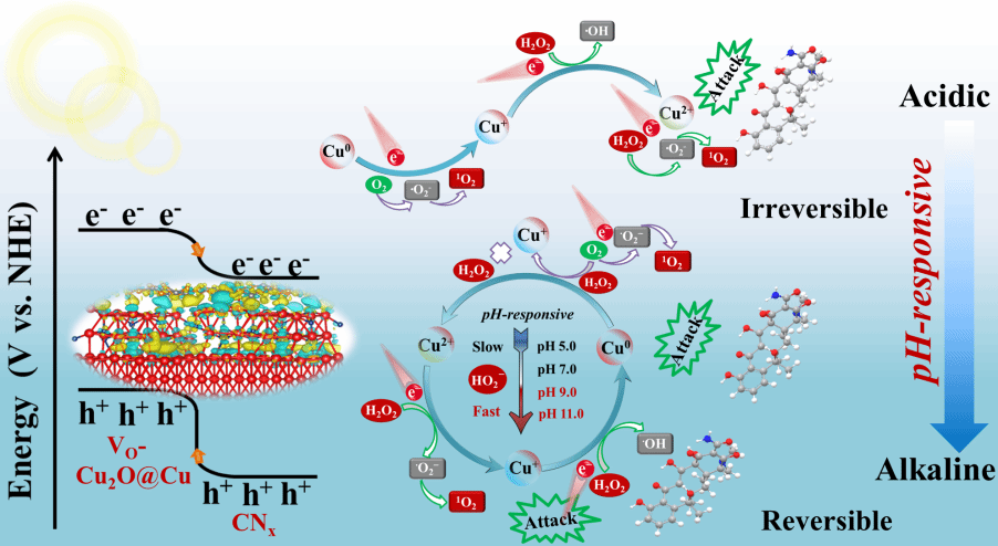 铜基催化过氧化氢(H2O2)工艺在水净化高级氧化工艺中显示出巨大的有机污染物去除潜力。然而,提高H2O2的活化效率并维持长期稳定的活性氧物种(ROS)生成是实现高效水净化的核心目标。值得注意的是,氧化亚铜(Cu2O)的反应动力学常数为kCu+/H2O2 = 1.00×104 M−1 s−1,是一种有效的光辅助H2O2活化剂,可以快速活化H2O2;然而,它的氧化还原不稳定性,导致Cu+不可逆歧化生成Cu0和Cu2+,很大程度上限制了它的应用。因此构建一个理想的Cu2O基光催化剂来实现氧化还原歧化可逆(Cu+⇋Cu0+Cu2)是有意义的。
