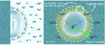 本图直观展示了O2气泡固定在多孔碳电极表面所形成的“气-液-固三相界面”上的离子分布与H2O2生成机制。在电极施加+1.1 V电位下,气泡的双电荷层内形成富集的OH−区域,显著降低其氧化为羟基自由基(•OH)的能垒。随后,•OH可进一步偶联生成H2O2(红色箭头)。与此同时,H2O也可直接通过双电子氧化路径生成H2O2(蓝色箭头),该过程在气泡提供的疏水环境下避免了•OH过度氧化。此外,气泡周围的O2还能捕获前述反应释放的电子,通过化学还原途径生成H2O2(绿色箭头)。三种路径协同作用,实现了在无催化剂条件下对H2O2的绿色电合成。