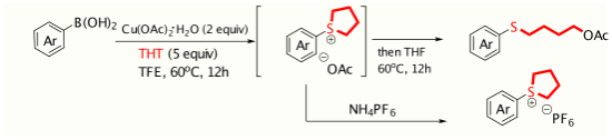该研究工作开发出一项创新性Chan-Lam反应实验设计,成功实现环状硫醚与芳基硼酸在开放体系中的高效偶联,为功能性芳基噻蒽盐合成提供新路径。该方案突破传统硫醚底物的反应限制,通过三氟乙醇溶剂抑制与NH₄PF₆阴离子交换手段,实现了硫鎓盐的稳定制备。其教学适配性设计尤为突出:采用模块化定时加热装置的使用使长时间反应符合安全操作流程,而针对四氢噻吩和三氟乙醇等试剂的防护操作,为实验操作中的试剂使用提供规范。通过实验部分的层析监测、溶剂转换诱导产物分解等关键节点,形成“现象-机理”探究链条,使前沿铜催化机理(转金属化-歧化-还原消除)转化为可观测的教学案例。这种基础操作承载前沿科学的设计理念,为设计高阶化学实验课程提供了可借鉴的范例。