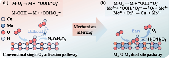 传统高级氧化过程(AOPs)依赖羟基自由基或硫酸根自由基等活性氧物种,但存在选择性差、寿命短、需外加氧化剂或能量输入等问题。1O2具有适中氧化电位和长寿命优势,但其自发生成面临自旋禁阻和中间体脱附瓶颈。本研究创新性地构建了不对称Cu+-O-Mo6+双位点,精确调控纳米通道,限域效应增强了局部反应物浓度和电子转移效率,在无外加化学活化剂或能量的条件下,直接驱动O2到1O2的转化。