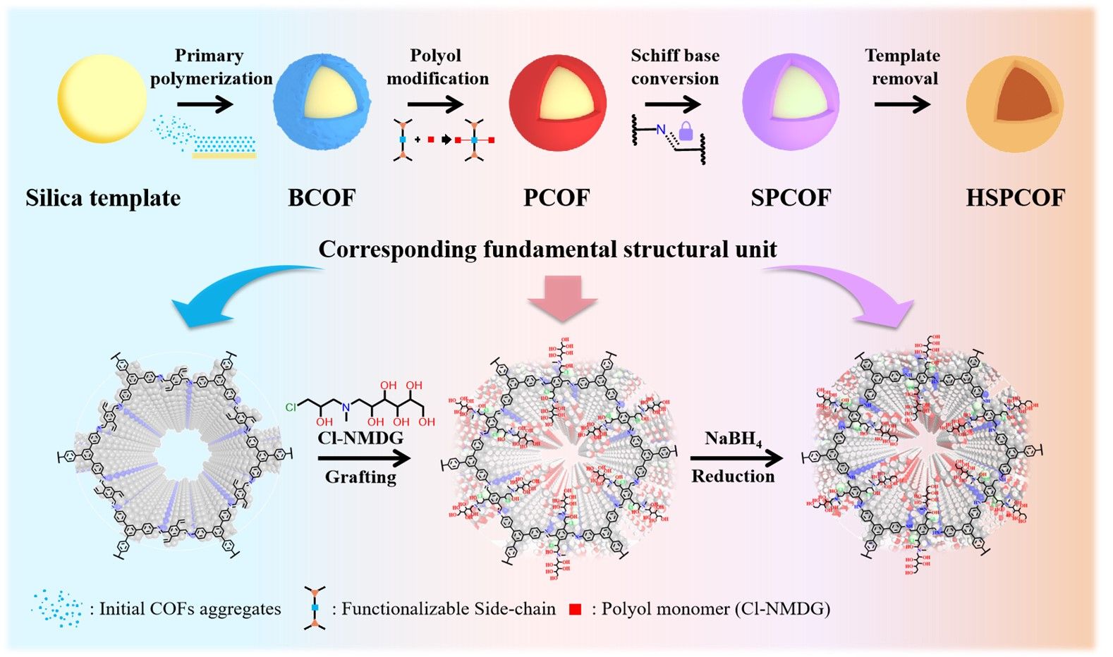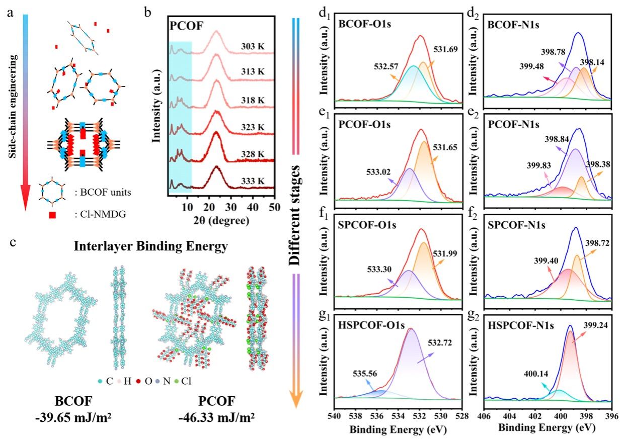 共价有机框架(COFs)作为新兴的多孔晶态材料,在分离纯化领域展现出广阔前景,其性能优势源于高度有序的层状堆积与规则的孔道结构。然而,实际合成过程中易出现堆积无序与功能位点可及性受限等问题,从而影响其分离性能。该研究基于对COFs在硅基介质表面生长行为的SEM与XRD分析,揭示了其结构演化机制,并提出了一种基于侧链工程的结构重构策略。通过单元锚定多元醇侧链实现功能化,同时依靠其对单元稳定性的提升实现了COFs晶体有序度的强化。在经稳定化修饰及模板去除后,成功获得了具有中空结构的、较大比表面积的及多元醇功能化的COF吸附剂(HSPCOF)。该材料兼具高比表面积、连通孔道与优异的化学稳定性,可在298 K下实现150.05 mg g-1 的硼吸附容量,是商业树脂MK51的10倍以上。密度泛函理论(DFT)计算表明,多元醇侧链可与硼酸根形成双齿环状酯络合物,从而赋予材料高选择性与强结合能力。即使在高盐湖卤水中,HSPCOF仍表现出优异的稳定性与91.51%的硼去除率,验证了其在复杂体系中的应用潜力。本研究不仅阐明了COF在硅模板表面的生长与重构机理,还提出了一种通过侧链工程实现结构有序化与功能精确调控的普适策略,为中空功能化COF材料的可控制备及高效分离应用提供了新的思路。