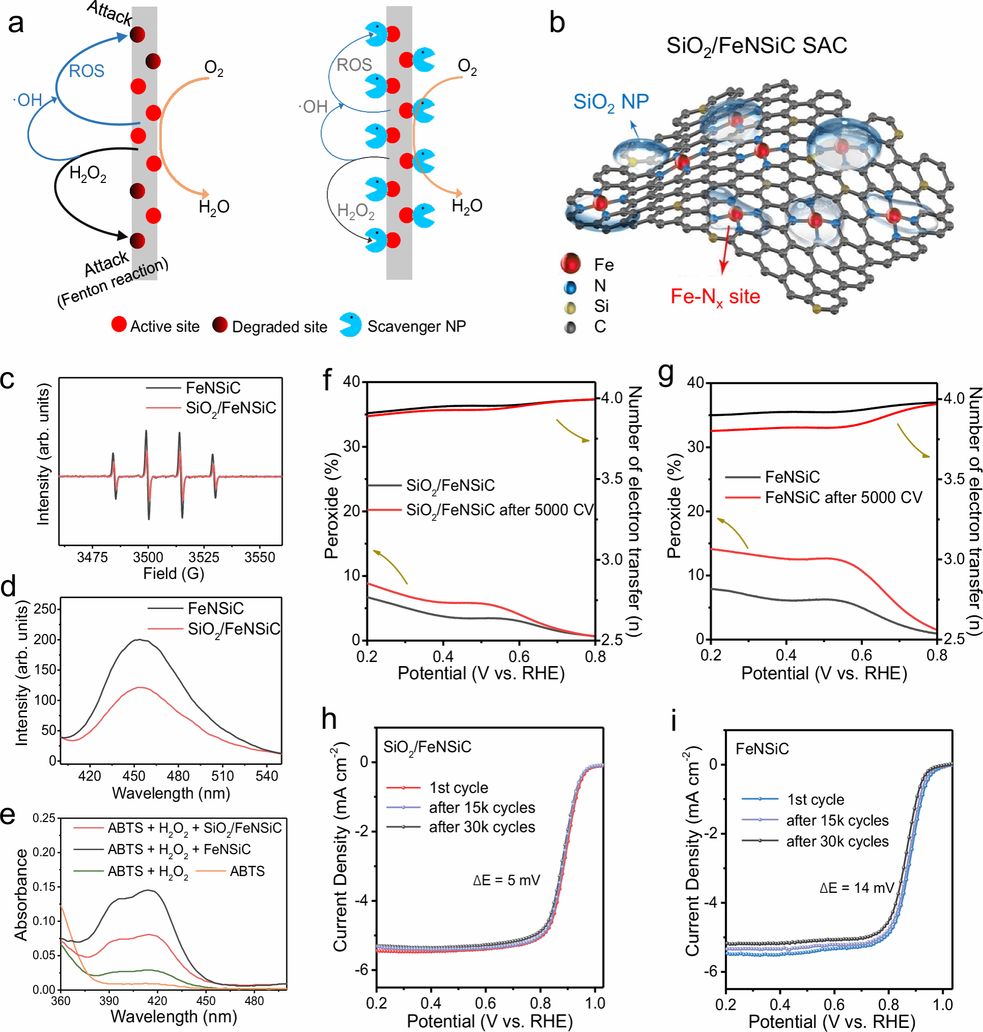 在燃料电池、锌空气电池等清洁能源体系快速发展的背景下,氧还原反应(ORR)催化剂是决定能量转化效率和装置寿命的核心材料。目前行业仍主要依赖铂基催化剂,但 Pt 的稀缺性和高成本严重限制了产业规模化。过去十年中,Fe-N-C单原子催化剂因其优异本征活性、丰富的可设计性以及成本优势,被视为最具潜力的 Pt 替代者。然而,这类催化剂在实际运行条件下易受到反应中产生的过氧化氢(H2O2)及羟基自由基(•OH)侵蚀,导致Fe–N4位点逐步失活甚至重构,催化层整体稳定性大幅下降,成为制约其应用的核心障碍。针对这一关键科学问题,研究团队跳出传统“加强碳架构”或“稳定单原子结构”的常规路径,提出“主动清除攻击性物种”的全新耐久性设计理念